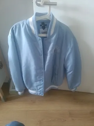 Chaqueta bomber de Tommy Jeans en color azul. Un clásico estilo universitario. Solo puesta 1 vez. - Cuello y puños con detalles de rayas blancas. - Cierre de botones a presión. - Bolsillos laterales. - Logo bordado en el pecho.