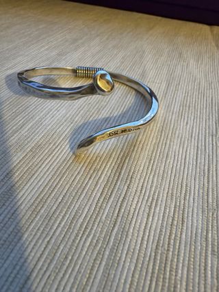 Elegante pulsera de la marca Uno de 50. - Diseño abierto y moderno. - Acabado plateado martillado. - Detalle de espiral en un extremo.