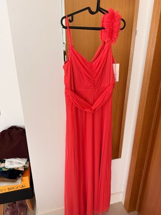 Elegante vestido largo para ocasiones especiales. Su diseño fluido y el detalle en el hombro lo hacen único. - Color coral vibrante. - Tirantes finos. - Detalle fruncido en el corpiño. - Cinturón drapeado. - Falda larga y vaporosa. - sin estrenar - La tela es un tul muy ligero y con caida