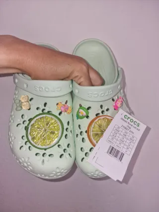 Zuecos Crocs con un diseño divertido y veraniego. - Color principal verde menta. - Adornos de rodajas de cítricos (lima y naranja). - Detalles de flores caladas. - Charms adicionales de caramelos