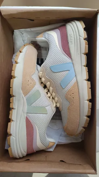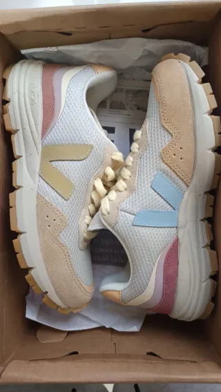 Zapatillas deportivas Veja en tonos beige, rosa y azul claro. Diseño moderno y cómodo. - Paneles de ante y malla. - Detalle de la V lateral. - Suela de goma.