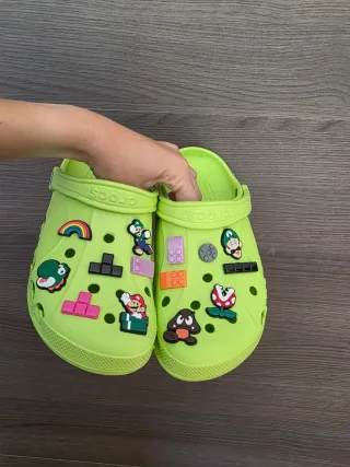 Crocs de color verde brillante con divertidos charms temáticos de Super Mario. - Charms de personajes como Mario, Luigi, Yoshi y Goomba. - Incluye elementos de bloques y plantas piraña. - Diseño único y personalizable.