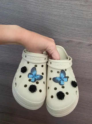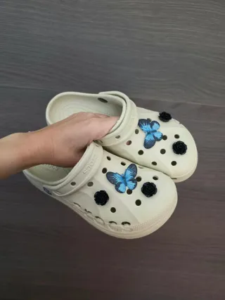 Crocs beige con adornos de mariposas azules y flores negras. - Diseño con agujeros. - Adornos de mariposas. - Adornos de flores.