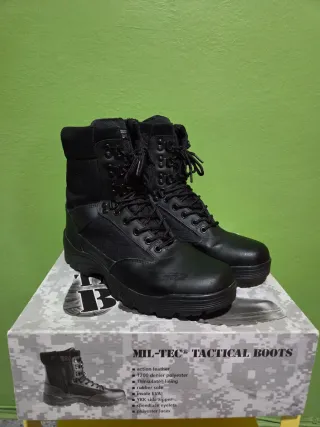 Botas tácticas de combate de cuero negro. - Parte superior de cuero y poliéster de 1200 denier. - Forro Thinsulate. - Suela de goma. - Plantilla de EVA. - Cremallera lateral YKK. - Ojales para cordones. - Cordones de poliéster.