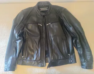 Chaqueta de piel negra de BMW Motorrad. Modelo Black Leather. Protecciones en hombros y codos y proteccion de espalda opcional. Cremallera de union perimetral En muy buen estado - Material: Cuero hidrofugado - Color: Negro. - Cierre de cremallera frontal. - Bolsillos con cremallera.