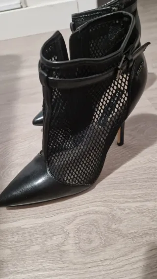 Botines de tacón alto con diseño de malla. Usado una sola vez,falta la tapeta de un tacón. - Punta afilada. - Cierre lateral con hebilla. - Detalle de malla transpirable.