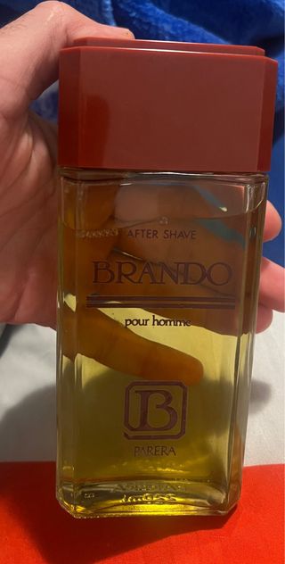 Loción para después del afeitado Brando Pour Homme. - Botella de vidrio con tapa roja. - Líquido de color amarillo.