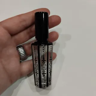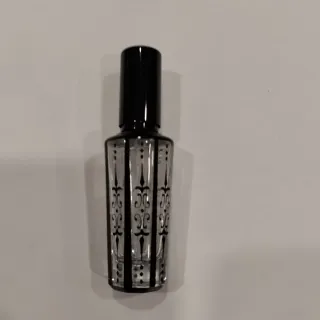 Elegante difusor de perfume con un diseño gótico. - Frasco de cristal transparente con detalles en negro. - Tapa negra. - Patrón decorativo vertical con motivos ornamentales. - 9,5 x 3 cm.
