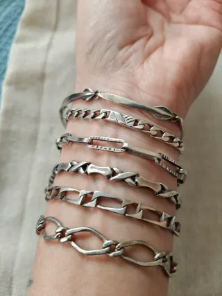 seis pulseras de plata con diferentes diseños. Desde arriba las primeras 2 son a 25€ cada una Las otras 4 son a 20€ cada una