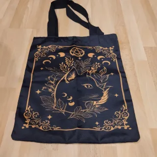 Práctica bolsa tote con un diseño místico de gato negro y detalles dorados. - Estampado de gato negro rodeado de elementos botánicos y celestes. - Marco decorativo con motivos ornamentales y estrellas. - Símbolo de pentagrama y lunas presentes en el diseño. - 34 x 41 cm.