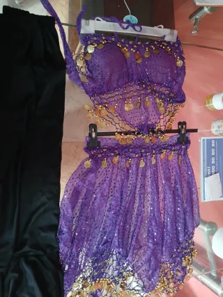 Traje medieval y capa - Top con lentejuelas y monedas doradas. - Falda a juego con detalle de monedas. - Cinturón con adornos. - Tejido brillante y ligero. Traje de monedas 30€ falda 10€ y la capa mas vestido 50€