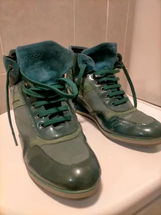 Botines de cuña Geox en tonos verdes y petróleo. - Diseño moderno y cómodo. - Detalle de cordones. - Acabado brillante y ante. Poco usados, muy cómodos, siempre con plantillas, interior impecable, exterior ante, interior cuero y membrana de transpiración. Han sido cuidados con mimo. Tonos verdes y azules.