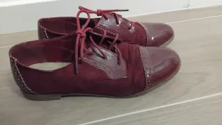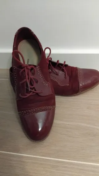 Elegantes zapatos estilo Oxford en color granate. Combinan ante y charol para un look sofisticado. - Cierre con cordones. - Detalle de picado en los bordes. - Diseño bicolor.