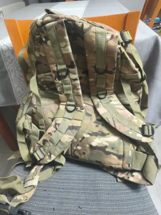 Mochila Multicam, ideal para actividades al aire libre. - Diseño con múltiples correas MOLLE. - Cierre de cremallera. - Panel de velcro en la parte frontal.
