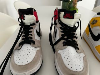 Zapatillas Air Jordan 1 con un diseño icónico. - Combinación de colores beige, negro, rojo y blanco. - Logo Air Jordan en el lateral.
