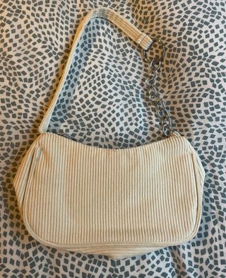 Bolso de pana en color beige, con un diseño moderno y cadena metálica. - Material: Pana - Color: Beige - Detalle: Cadena metálica plateada - Cierre: Cremallera