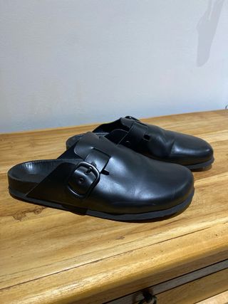 Zuecos de piel en color negro. - Diseño con hebilla. - Material exterior de piel.