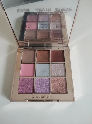 Paleta de maquillaje Charlotte Tilbury con un diseño degradado de rosa a dorado y detalles de estrellas brillantes. - Diseño con estrella central. - Acabado brillante y festivo.
