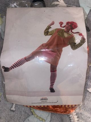 Disfraz inspirado en Pipi Calzas Largas, ideal para adultos. - Vestido a rayas rojas y verdes. - Calcetines a rayas rojas y blancas. - Peluca de pelo rojo trenzado.