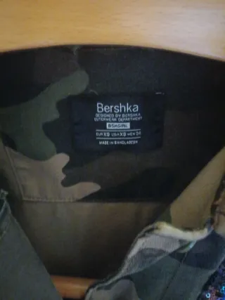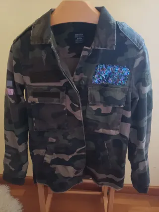 Camisa de camuflaje con detalles únicos. - Parche de lentejuelas brillantes en el pecho. - Diseño con múltiples bolsillos. - Acabado deshilachado en el bajo.