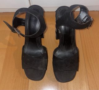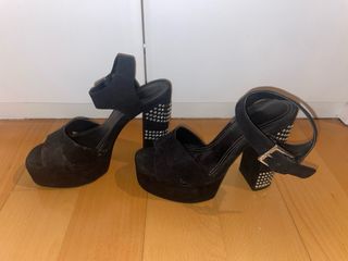 Talla 36. Color negro. Tacón de aproximadamente 12 cm y plataforma de 3 cm, muy estables. Detalle de tachuelas decorativas en el tacón. Estado: buen estado, con señales normales de uso en la suela y falta alguna tachuela, visible en las fotos. Cómodas y versátiles, ideales para eventos, fiestas o salir de noche. 📸 Se venden tal cual aparecen en las fotos.