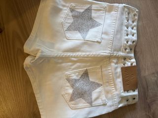 Shorts vaqueros blancos de la marca ONE DENIM con un diseño único. - Detalle de estrellas plateadas brillantes en los bolsillos traseros. - Tachuelas plateadas decorativas en los laterales. - Parche de cuero con el logo de la marca.