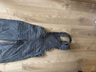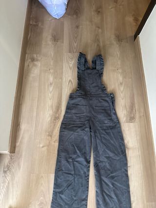 Mono de tela vaquera en color gris. Tiene un diseño moderno con tirantes y detalles de volantes. - Dos bolsillos traseros. - Cierre lateral con botones. - Piernas anchas.