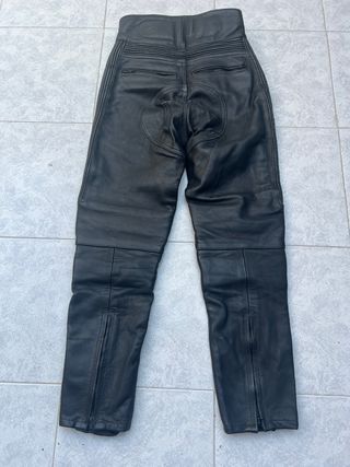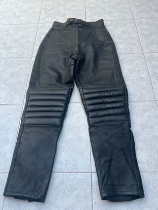 Pantalón de motorista de cuero. - Diseño con protecciones acolchadas en rodillas y espinillas. - Cintura con trabillas para cinturón y cierre de cremallera, botón y hebilla - Costuras reforzadas en zonas de alta fricción.
