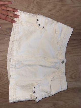 Falda de tela en tono beige, con un diseño moderno y práctico. - Detalle de bolsillos cargo. - Cierre con botón y cremallera. - Costuras reforzadas.