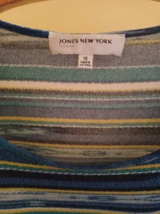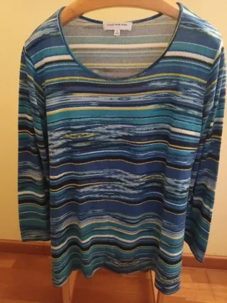 Camiseta de manga larga con un estampado vibrante y moderno. - Diseño de rayas horizontales en tonos azules y turquesas. - Cuello redondo. - Tejido ligero y cómodo.
