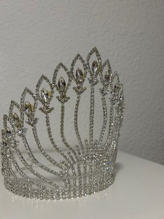 Elegante corona tipo tiara adornada con brillantes. - Diseño intrincado y detallado. - Acabado plateado que refleja la luz. - Perfecta para eventos especiales o como accesorio de moda.