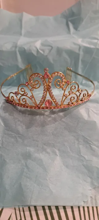 Elegante tiara con un diseño delicado y adornos brillantes. - Base metálica dorada. - Detalles en pedrería de color rosa y transparente. - Incorpora un peine para facilitar su sujeción. Tengo 3 en mi perfil quedatelas por 15€ todas.