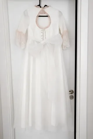 Vestido de comunión talla 10 años, blanco con detalles en rosa. Incluye tiara. - Media manga de encaje. - Fajín con flores decorativas. - Cuello con puntilla. -Tiara a juego con el fajín de flores. -Se regalan alpargatas número 34. Se puede ver sin compromiso