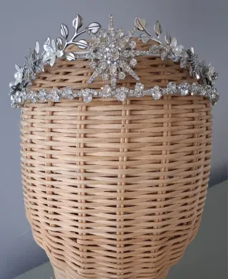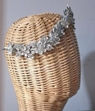 Preciosa tiara personalizada, hecha a mano, por "Carmen Marya Saiz" diseñadora en Madrid. Está hecha con materiales súper ligeros, no pesa nada, se adapta perfectamente, aunque se ve grande es muy ligera, tiene 3 erizos de cristales brillantes, hojas plateadas, piedrecitas q le dan un toque de luz al movimiento, todo muy estilizado, tiene 2 peinas para acoplarlo mejor, es precioso, se conserva en su caja tal como lo compré de primeras, solo 1 puesta, su precio original es de 1100€ .