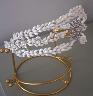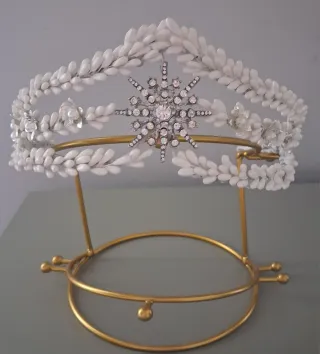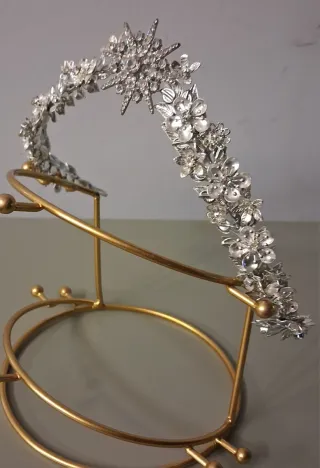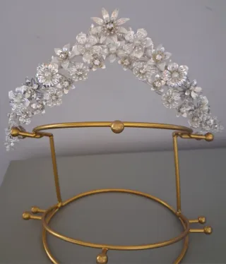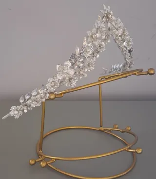 Elegante tiara o diadema con un diseño floral delicado, perfecta para peinados de novia o eventos especiales. - Elaborada con detalles plateados y adornos blancos. - Diseño con múltiples flores y cristales. - Montada sobre una base dorada para exhibición.