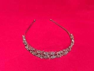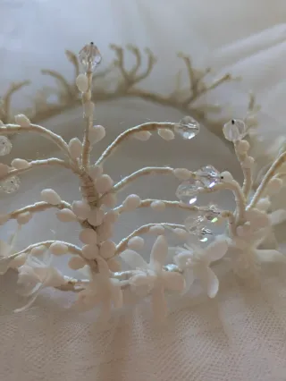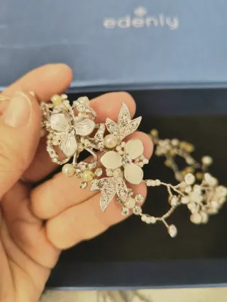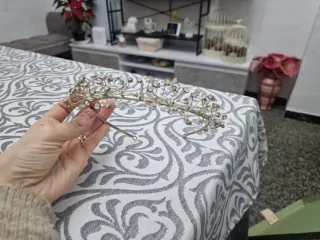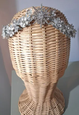 Elegante tiara sin estrenar para novia con un diseño floral delicado y adornos de brillantes. - Diseño de ramas y flores. - Detalles con pedrería. - Acabado metálico. Es preciosa.