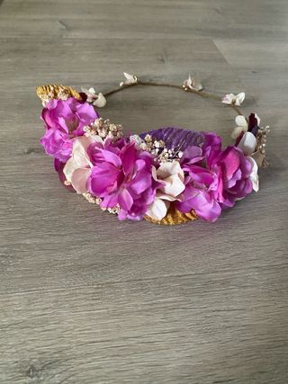 Preciosa tiara adornada con flores variadas en tonos rosas y púrpuras, ideal para ocasiones especiales. - Base dorada con textura. - Flores de tela y detalles de pequeñas flores secas. - Adorno central de tejido morado.