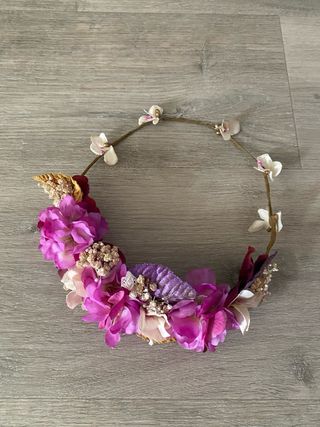 Preciosa tiara de flores, ideal para ceremonias o eventos especiales. - Diseño circular con flores variadas. - Combina tonos rosas y morados. - Adornada con detalles delicados.