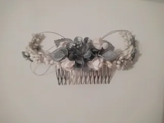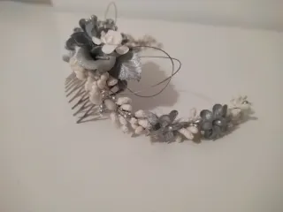 Tiara de novia en porcelana, usada en boda y postboda. Encaja a la perfección gracias a la peina y sirve tanto para recogido o para pelo suelto. Elaborada artesanalmente con un diseño floral delicado. - Adornada con flores y detalles plateados. - Combina tonos blancos y plateados.