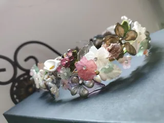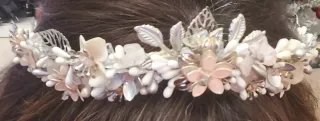 Preciosa tiara adornada con delicadas flores y perlas. - Diseño floral con detalles en porcelana. - Incorpora pequeñas perlas. - Acabado en tonos rosados y blancos.