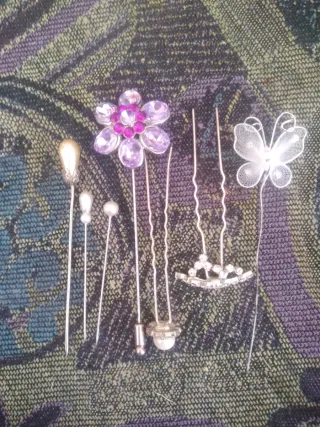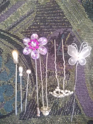 Conjunto de alfileres decorativos, ideales para peinados de novia o eventos especiales. - Diseño de flor con pedrería. - Alfiler con mariposa de tul. - Adorno en forma de tiara con brillantes. - Alfileres con perlas.