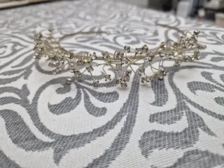 Preciosa tiara de novia con un diseño floral delicado. - Adornada con pequeñas perlas y detalles brillantes. - Estructura metálica con acabado plateado.