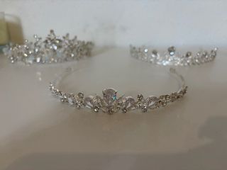 Conjunto de tres tiaras para novia, con un diseño elegante y brillante. - Elaboradas con pedrería y detalles plateados. - Perfectas para complementar un peinado de boda.