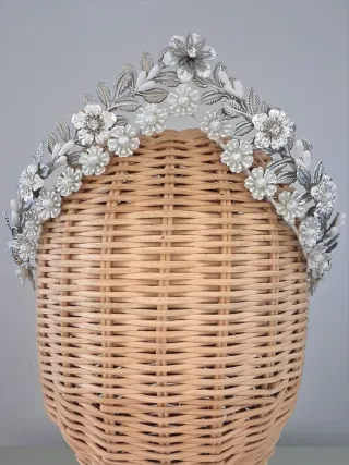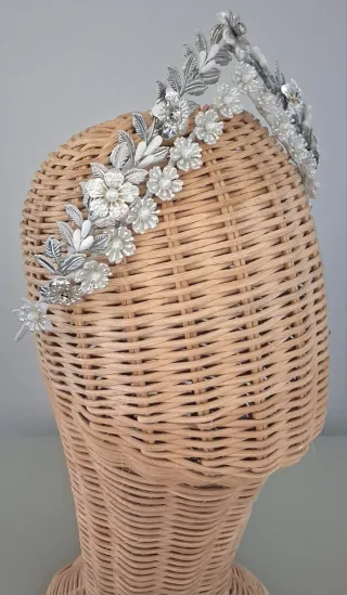 Hecha a mano, metalizada, flexible se adapta muy bien - Diseño floral con detalles plateados. - Elementos blancos que aportan luminosidad. - Ideal para complementar un peinado de boda. Más modelos en mi perfil