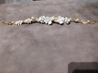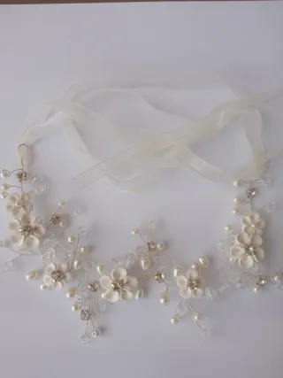 Precioso tocado o tiara para el pelo, adornado con delicadas flores, perlas y cristales. - Diseño floral con detalles brillantes. - Incorpora cintas para atar y ajustar. - Ideal como accesorio para bodas o eventos especiales.