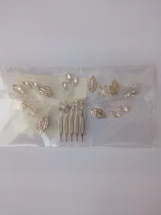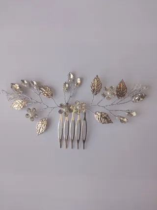 Elegante tocado o peineta para el cabello, adornado con delicadas flores y cristales brillantes.Nueva a estrenar.Dispongo de varias unidades. - Diseño floral con hojas y cristales tallados. - Combina tonos dorados y plateados.