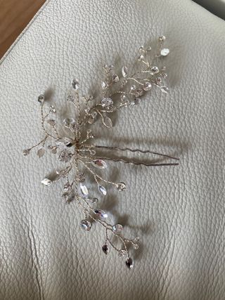 Elegante tiara o tocado, ideal para novias o eventos especiales. Su diseño combina brillo y delicadeza. - Adornada con pedrería y perlas. - Acabado plateado. Tiara o tocado para novia, comprada pero finalmente no usada. Hecha a mano con cristales y perlas. Tiene horquillas a los lados para fijar al pelo.