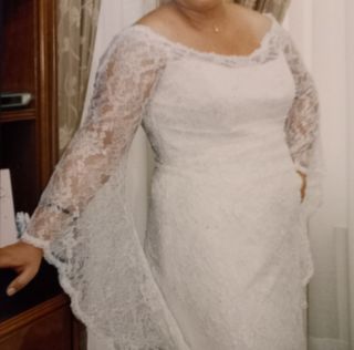 Vestido de novia precioso, con el toque de las flores lo hace muy especial, tuvo mucho éxito, usado solo el día de la boda. Para el tema de medidas, yo mido 1,70 y tenía de talla de pantalón entre la 40 y 42. Después de la boda se llevo a la tintorería para lavarlo y está guardado. Tengo también el velo y el tocado en mi perfil, por si te interesa, se puede hacer un pack