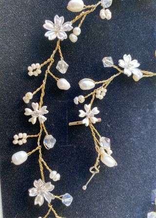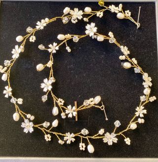 Precioso tocado artesanal, perfecto para complementar un peinado de novia o de fiesta. Su diseño delicado combina brillo y elegancia. - Elaborado con alambre dorado. - 54cm longitud - Adornado con cristales transparentes. - Incluye perlas de diferentes tamaños. - está pensado como tocado, pero también puedes emplearse como gargantilla o brazalete, dado que lo puedes moldear a tu gusto.