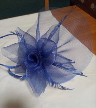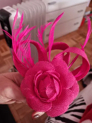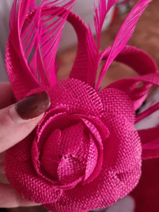 Precioso tocado para el pelo con un diseño floral de sinamy en color fucsia y detalles de plumas y lazo. - Elaborado con tela. - Adornado con plumas. - Estilo llamativo. Lleva clip y broche en la parte trasera, por lo que puede colocarse fácilmente en el cabello o usarse como adorno en ropa o bolso. Perfecto para bodas, comuniones, eventos o ferias. Está en muy buen estado, prácticamente nuevo.